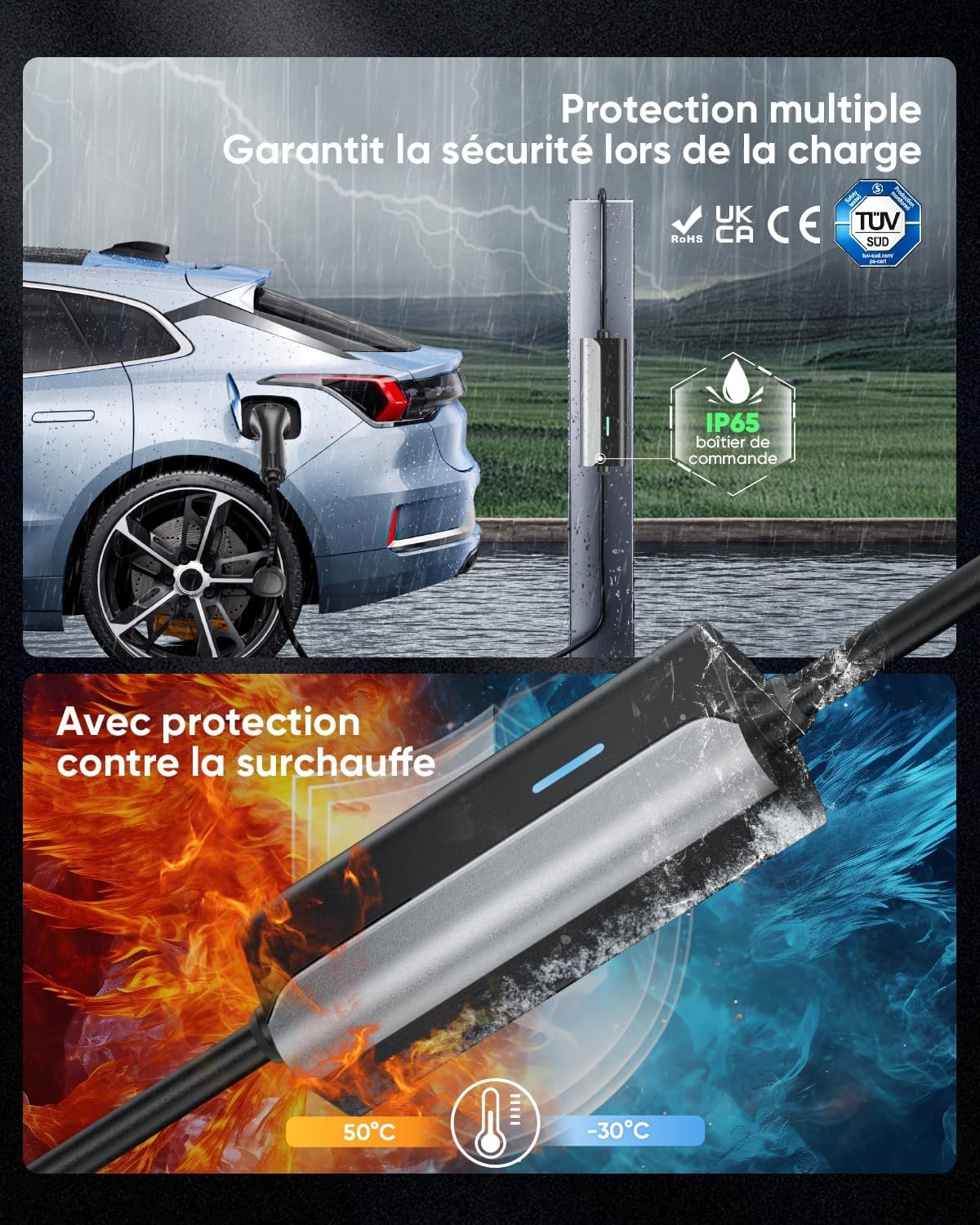 【SÉCURITÉ MAXIMALE】 Le chargeur est certifié CE, UKCA et UL, et intègre huit mécanismes de protection pour garantir une utilisation en toute sécurité, incluant la protection contre la surcharge, la surchauffe, les fuites de courant, les surtensions et sous-tensions, ainsi que la protection contre les courts-circuits. Vous pouvez ainsi recharger votre véhicule en toute tranquillité, sachant qu’il est protégé à chaque étape.
